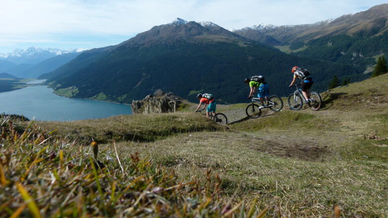 Start: An der ➊ Staumauer am Reschensee. Zum Einrollen auf der orographisch rechten Seite des Reschensee entlang bis zum ➋ Reschenpass. Abfahrt über den Fahrradweg zur ➌ Grenze Richtung Nauders. ➍ 800 m vor der Seilbahn Bergkastel scharf rechts. Auffahrt über eine Schotterstraße bis zur ➎ Bergkastelalpe. Wer Lust und Zeit hat oder Durst verspürt, sollte die 120 Höhenmeter bis zur Bergstation Bergkastel hochpedalieren. Ab jetzt beginnt der schönste Teil der Tour. Über den Auffahrtsweg zurück bis zur Bergkastelalpe und links weiter zum Hochmoor ➏ Plamortböden sowie den ➐ Panzersperren. Nach der Überwindung der Sperren, eröffnet sich der ➑ Ausblick über den Vinschgau mit der einzigartigen Seenlandschaft. Die Abfahrt nach Reschen erfolgt über die Forststraße bis ➒ Reschen. Technisch versierte Biker nehmen den Endurotrail (Achtung schwierige Abfahrt – S3-Passagen). Die Rückfahrt zum Startpunkt erfolgt über den Fahrradweg.