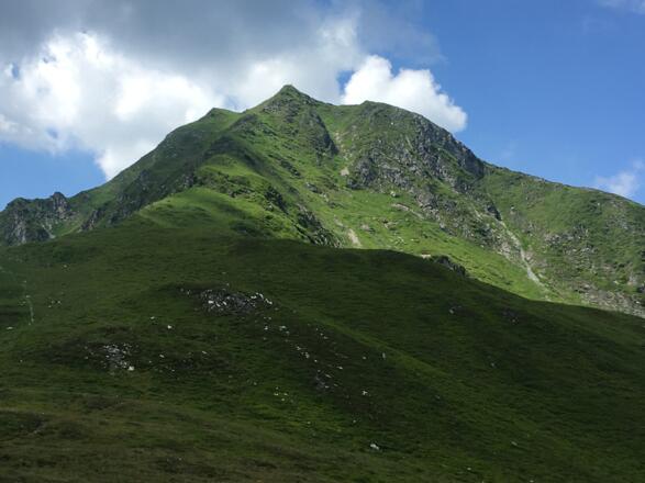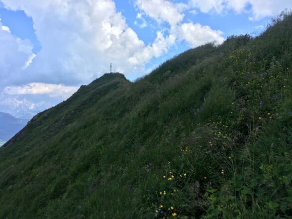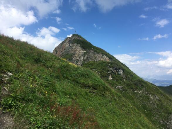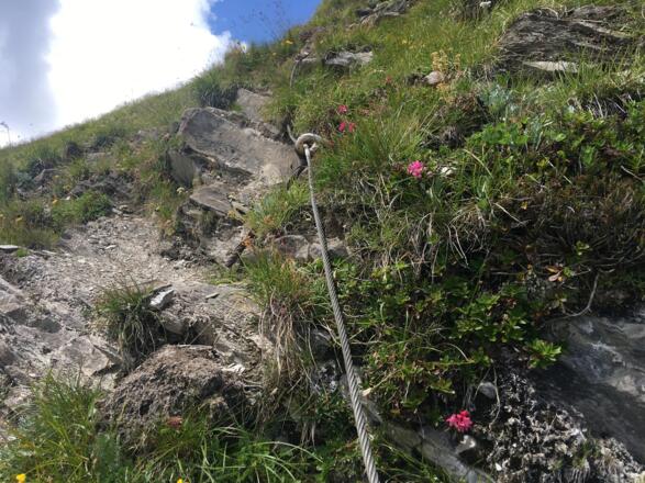 Steile Grasflanken, kurze Felspassagen, teilweise mit Drahtseilen versichert.