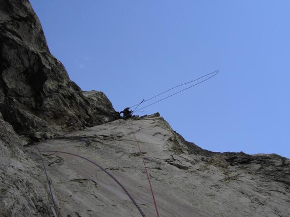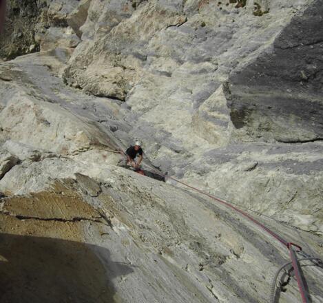 alpine, extrem steile und ausgesetzte Route, die mit Bohrhaken eingerichtet ist. An einigen Stellen sind mobile Sicherungen nötig. Der Fels ist an wenigen Stellen etwas brüchig, stört aber den Gesamteindruck der Route nicht. Von unten sah die 6. SL fast unüberwindbar aus, ist aber in anstrengender und diffizieler Kletterei machbar (gar nicht einmal so schwer! 7c)