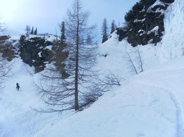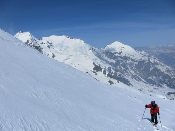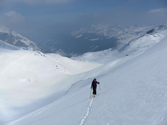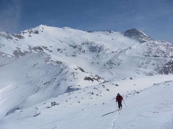 Abstieg und Abfahrt entlang des Anstiegsweges. Als Variante kann mit ein wenig Gegenanstieg von der Niederen Scharte zur Fraganterscharte angestiegen und über die Wintergasse, eine lange Nordwestrinne, abgefahren werden.