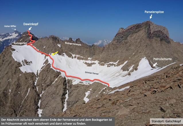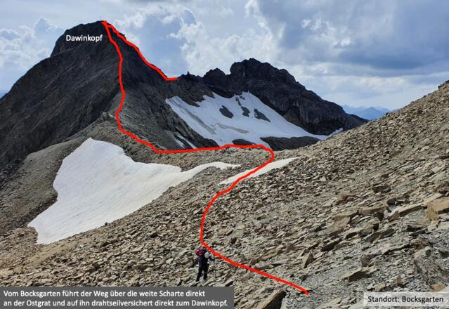 Am Ferner angekommen wendet man sich nach links und hält sich am besten in der Mitte des Ferners. Der Einstieg in die drahtseilversicherte Querung zum Bocksgarten ist im Frühsommer nicht immer einfach zu finden. Bitte schaut auch die Bilder an. Die Stelle ist mit einem gelben Pfeil auf ihnen markiert. Im anschluss überschreitet man den weiten Sattel und hält auf den wieder versicherten Ostgrat des Dawinkopfs zu.