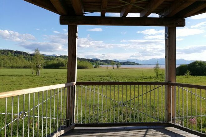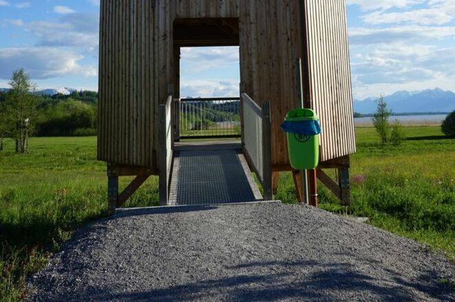 Der neu errichtete Aussichtsturm am Simssee bei Eichen bietet eine tolle Aussicht über den See bis in die Inntaler Berge.