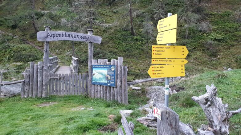 Es wäre genügend Zeit am Wegesrand die Trojer Mühlen zu besuchen. Eine Schaumühle, zu der wir ein klein wenig absteigen müssten. Wer möglichst viel Forstwege umgehen möchte, kann dann auch rechtsseitig des Baches den Weg fortsetzen. Ich lasse die Mühle am Wegesrand liegen, folge den Weg geradeaus und wähle am nächsten Abzweig die linke, gradliniege Spur. Sie führt am Beginn des Almblumenweges vorbei, ein Blick von der Brücke, oder eine kleine Rast und schon geht es bald daruf durch Wiesen weiter. Es folgt nochmals ein kleines Stück Forststraße bevor ab der Hinteren Trojeralm (2001m) endgültig der Bergpfad beginnt. Er führt reletiv sanft ansteigend, im letzten Stück etwas steiler werdend stetig direkt der Neuen Reichenberger Hütte entgegen.