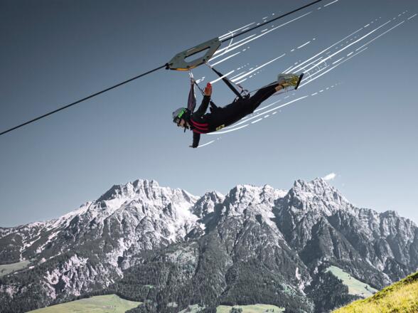 „Flying Fox XXL“ heißt das Abenteuer, das dich wie Superman mit bis zu 130 Kilometer pro Stunde ins Tal rauschen lässt. Von der Stöcklalm fliegst du volle 1,6 Kilometer über das Tal und genießt in 143 Metern Flughöhe einen fantastischen Ausblick über die atemberaubende Leoganger Bergwelt. Buchungshotline +43 6583 8219 - 390.