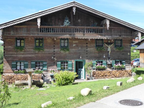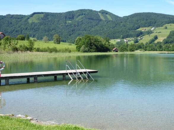 Nach der Brücke geht's über die Zeller Ache rechts in die Ortschaft Kasten (560 m) an der Bundesstraße 154. Gegenüber dem Parkplatz vor dem leider geschlossenen Kastenwirt biegen Sie links auf den beschilderten Irrseeweg ab. Seine schmale Asphalttrasse (auch Radweg) Richtung „Zell am Moos“ führt nun gut 1 km neben der Bundesstraße 154 dahin (dazwischen befindet sich links der schöne Badeplatz der Gemeinde Tiefgraben am Südufer des Irrsees). Dann folgen Sie links der Zufahrt nach Zell am Moos (573 m). 2:30 h