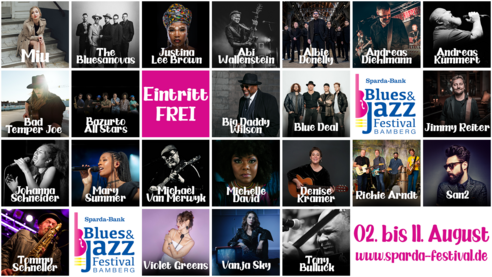 Ab 02. August 2024 verwandelt sich Bamberg in das Zentrum der Blues- und Jazzmusik. Das zehntägige Spektakel „Best Of Blues & Jazz“ bietet rund 150.000 Besuchern 60 Live-Konzerte auf verschiedenen Bühnen in der Stadt und im Landkreis Bamberg. Der Eintritt ist frei! Zu den Headlinern gehören renommierte Größen wie Richie Arndt, Abi Wallenstein, Gregor Hilden, Albie Donelly, Big Daddy Wilson, San 2, Justina Lee Brown, Michael van Merwyk, Blue Deal, The Bluesanovas, Jimmy Reiter, Andreas Kümmert und viele mehr. Neben der Sparda-Bank Nürnberg und der Deutschen Fernsehlotterie unterstützen viele regionale Unternehmen das Event, das vom Stadtmarketing Bamberg organisiert wird. Für die Deutsche Fernsehlotterie ist das Bluesfestival in Bamberg ihr drittes Festivalprojekt neben dem Rockfestival in Wacken und der Kieler Woche. Das Festivalabzeichen wurde in diesem Jahr vom bekannten Bamberger Kinderbuchsautor Paul Maar gezeichnet.