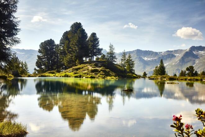 Rossbodenweg geht es zunächst nach Mathon. Von dort aus startet ein Forstweg, der durch einen Wald in das Lareintal führt. Entlang des Lareinbachs gelangt man schließlich zur Larein Alpe (1.850 m). Die Alpe liegt auf einem kleinen Plateau und wartet mit einem schönen Blick auf die umliegenden Berggipfel auf. Stellen Sie Ihr Bike im Bikedepot ab. Danach geht es zu Fuß weiter. Die Wanderung führt mitten durch einen herrlich duftenden Zirbenwald direkt zum malerischen Berglisee (2.115 m).