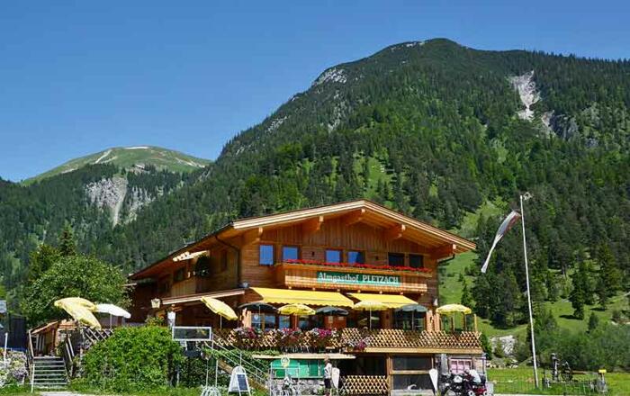 Von der Dramaturgie ist der heutige Verlauf unserer Mountainbiketour kaum zu überbieten. Zunächst geht es auf der Forststraße bergab ins Rißtal. Kurve um Kurve tritt die mächtige Falkengruppe mehr hervor, während sich zu unserer Linken der Blick ins sagenhafte Engtal öffnet. Der Große Ahornboden, dessen Landschaftsgeschichte nun auch in einem Buch unter dem Titel „Großer Ahornboden – Eine Landschaft erzählt ihre Geschichte“ nachgelesen werden kann, ist zweifelsohne ein Juwel im Karwendel. Einzigartig im ganzen Alpenraum zählt der Talboden über 2000 Ahornbäume; zwischen ihnen weiden die Kühe der größten Gemeinschaftsalm des Karwendels. Unser Forstweg trifft die Mautstraße aus Hinterriß, der wir taleinwärts folgen (1120 m). Während wir im Schatten der Ahornbäume bis zu den steilaufragenden Wänden des Talschlusses fahren, können wir den Eindruck des Tales ganz in uns aufnehmen. Vorbei am Alpengasthof Eng und dem großen Parkplatz passieren wir den Themenweg, der viele Informationen nicht nur über den Großen Ahornboden, sondern auch über den Naturpark und die Landwirtschaft bereithält. Am Ende des Almdorfes (1227 m, Einkehr-/Übernachtungsmöglichkeit) biegt ein Forstweg links ab, überquert den Talboden und steigt dann in einer Linkskurve an. Vorbei am Binsalm-Niederleger (1502 m, Einkehr-/Übernachtungsmöglichkeit) und Binsalm-Hochleger (1645 m), erreichen wir das Westliche Lamsenjoch (1940 m) und kurz darauf die Lamsenjochhütte (1953 m).