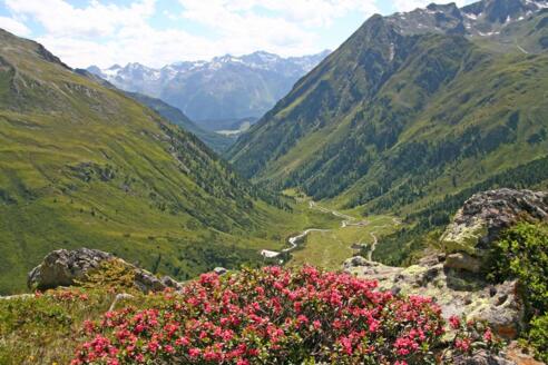 Beim Abstieg durch das Weite Kar hat man stets einen grandiosen Blick auf Niederthai und den Ötztaler Geigenkamm