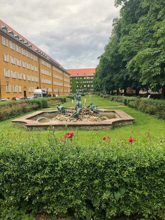 1923 kaufte der Bauunternehmer und Architekt Bernhard Borst ein ca. 90.000 m² großes Grundstück direkt an der Dachauer Straße. Er schrieb einen Architekturwettbewerb aus, um sein Ziel zu verwirklichen, auf diesem Grundstück Wohnhäuser und Werkstätten erbauen zu können. Auf dem Wettbewerb wurden unter 60 Teilnehmern zwar zwei Preise vergeben, einen Gewinner konnte Borst aber nicht ausfindig machen weswegen er sich dazu entschloss den Entwurf selbst anzufertigen. Der Bauunternehmer verfolgte dabei das Ziel die Schönheit eines Einfamilienhauses mit den praktischen Vorteilen einer Etagenwohnung zu verbinden. Die Verwendung von Kunst spielte für ihn eine große Rolle, weswegen sich in den Außenanlagen verschiedene Skulpturen und Reliefs finden lassen. Die Siedlung setzt sich aus 77 aneinandergereihten Mehrfamilienhäusern und 7 Höfen zusammen. Die Höfe sind mit 51 Statuen, einem Teich und neun Brunnen ausgestattet. Heute gibt es 772 zwei- bis fünf- Zimmer Wohnungen.