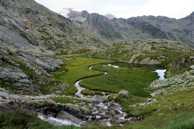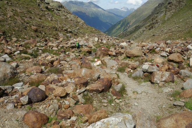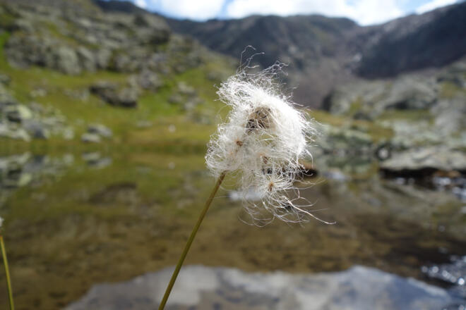 Eine kurze Wanderung, doch sehr reizvoll. Von der Bremer Hütte steigt der Weg stetig an bis es kurz vor dem Simmingjöchel (Zollhütte) zu einer leichten Kraxeltour wird. Es geht über Klammern Drahtseilversichert, maximal im zweier Schwierigkeitsgrad zum Jöchel. Der Abstieg Richtung Bremer Hütte zunächst über Felsplatten mit Klammern, später über unschwierigem Bergpfad ab, fällt uns leicht. Die satten nassen Wiesen, mit Wollgras und kleinen Bergseen sind eine Augenweite.