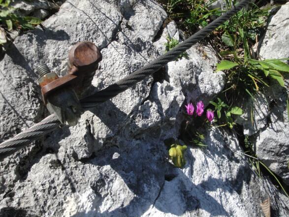 Nach einer leichten Linksquerung folgt eine Steilstufe mit einem Bügel und einer anschließenden leichten Rechtsquerung zu einer Nische. Die folgenden 20m sind die Schlüsselstelle. Zuerst leicht links haltend, dann rechts querend gehts es mit Hilfe vieler Bügel und Trittstifte, aufwärts. Die anschließenden 15m geradeaus aufwärts sind bereits viel leichter, obwohl auch noch Bügel vorhanden sind. Zuletzt erreicht man über leichtes Gelände den Ausstieg. Das Drahtseil endet nach einer flachen Rechtsquerung.