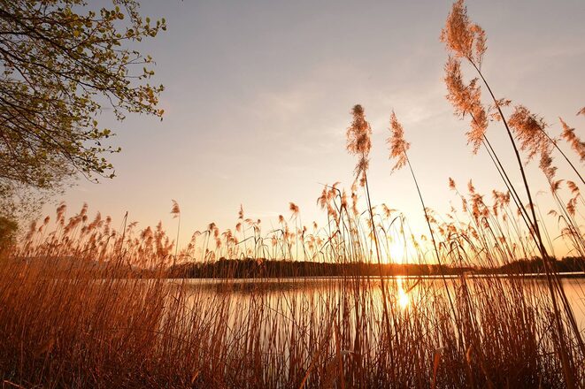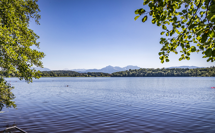 Umgeben von kleinen Wäldern und sanfter Wiesen des Naturschutzgebietes Haarmoos erstreckt sich das Strandbad entlang des Abtsee-Nordufers.