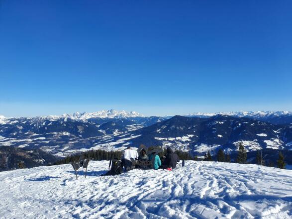 Ski- u. Schneeschuhtouren sind Ausdauersport. Die wertvollen Belastungsreize für Herz und Kreislauf setzen Gesundheit und eine gute Selbsteinschätzung voraus. Vermeide Zeitdruck und wähle das Tempo so, dass niemand in deiner Gruppe außer Atem kommt. Achte auf Kraftreserven für die Abfahrt.