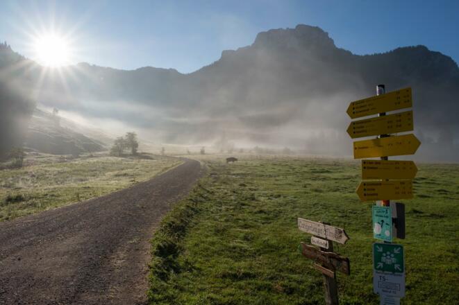 Einfache Wanderung in das Hochmoor der Röthelmoos Almen. Der Aufstieg über die Öfen führt auf einem kleinen Wanderweg durch den schattigen Bergwald. Bei verlassen des Waldes wartet ein schöner Überblick über die Moor- und Weideflächen der Röthelmoos Almen, während links oberhalb die markante Felsformation der Hörndlwand hervorschaut.
