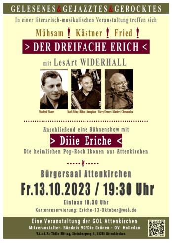 In einer literarisch-musikalischen Veranstaltung treffen sich Mühsam, Kästner und Fried mit LesArt WIDERHALL. Anschließend eine Bühnenshow mit " Diiie Eriche" Die heimlichen Pop-Rock Ikonen aus Attenkirchen.