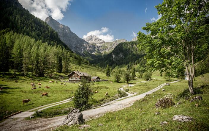 Wollten Sie schon immer einmal auf dem erklärten Lieblingsplatzl von Skilegende Hermann Maier platznehmen? Der gemütliche Wanderweg dorthin beginnt gleich hinter dem Parkplatz Marbachtal in Flachauwinkl. Damit Sie die rohgezimmerte Holzbank nicht verfehlen können, verweist ein glänzendes Schild an der Rückenlehne auf Flachaus sportlichen Sohn. Genießen Sie die Aussicht bevor Sie sich wieder auf den Weg machen.Wir sind nämlich noch nicht am Ziel. Unsere rund 6,5 Kilometer lange Tour führt uns zu beiden Marbachalmen und wieder zurück. Die schroffen Felsen der Radstädter Tauern und das glasklare Wasser der namensgebenden Marbach sorgen auf dem Rest des Weges für eine Kulisse wie aus dem Bilderbuch. Mit dem Kinderwagen auf eine Almhütte? Zum Glück ist der Weg so einfach zu bewältigen, dass selbst die jüngsten Bergfreunde mit entspannten Eltern ankommen. Mit anderen Worten: Das Almgebiet rund um die Vordere und Hintere Marbachalm ist ein Paradies für junge Familien. Dass dabei das leibliche Wohl der Gäste nicht zu kurz kommen darf, versteht sich von selbst. Sowohl die Prechtlhütte, als auch die Ennslehenhütte sind von Pfingsten bis Anfang Oktober durchgehend bewirtschaftet. Feinschmecker nutzen die gute Gelegenheit, um sich mit Käse, Speck, Brot und Butter direkt vom Bauern einzudecken.