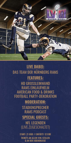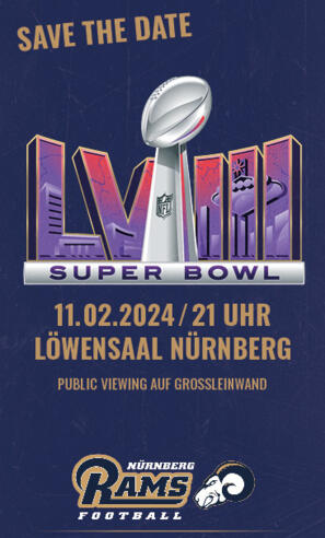 Die große Football-Party zum Super Bowl mit den NÜRNBERG RAMS, findet am Sonntag, 11.02.24 ab 21.00 Uhr im LÖWENSAAL in der Schmausenbuckstrasse 166, 90480 Nürnberg (beim Tiergarten/hotel) statt.