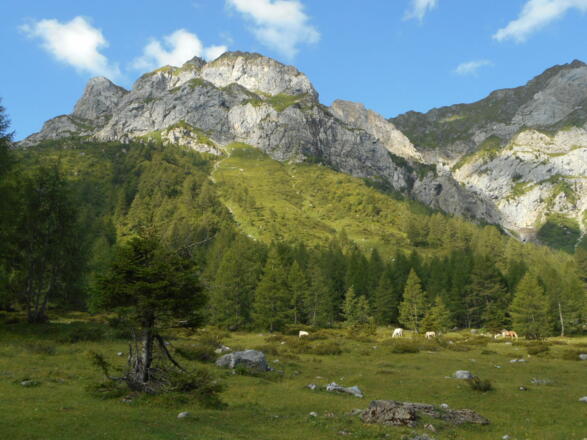 Auf schmalem Weg geht es weiter bergab: in kurzen Serpentinen gehen wir einen steilen Grashang hinab in Richtung Hochweißsteinhaus, das 1.900 m hoch liegt. Nun wandern wir über Almwiesen, immer wieder über kleine Bäche und Quellen.