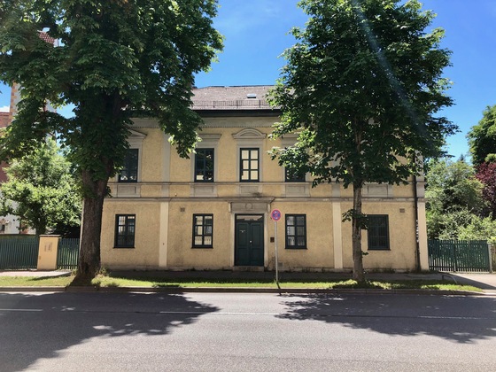 Hier befindet sich der erste Stopp: der Moosacher Stachus. Auf der linken Seite befindet sich die Netzer-Villa und schräg gegenüber, an der Dachauer Str./ Ecke Pelkovenstr. der alte Wirt.