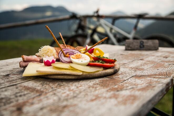 Die Weißenalm lockt mit einer almtypischen Brotzeit und einem phantastischen Blick auf die imposante Gedererwand.