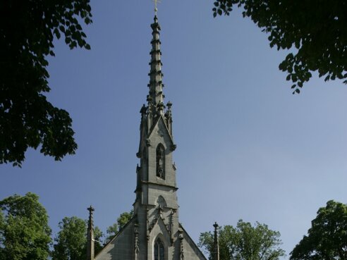 Ursprünglich älteste Pfarrkirche der Stadt auf dem sogenannten Totenberg außerhalb des Mauerrings gelegen. Die heutige Anlage wurde 1874/75 nach Plänen des Nürnbergers Georg Eberlein in neugotischen Formen erbaut.