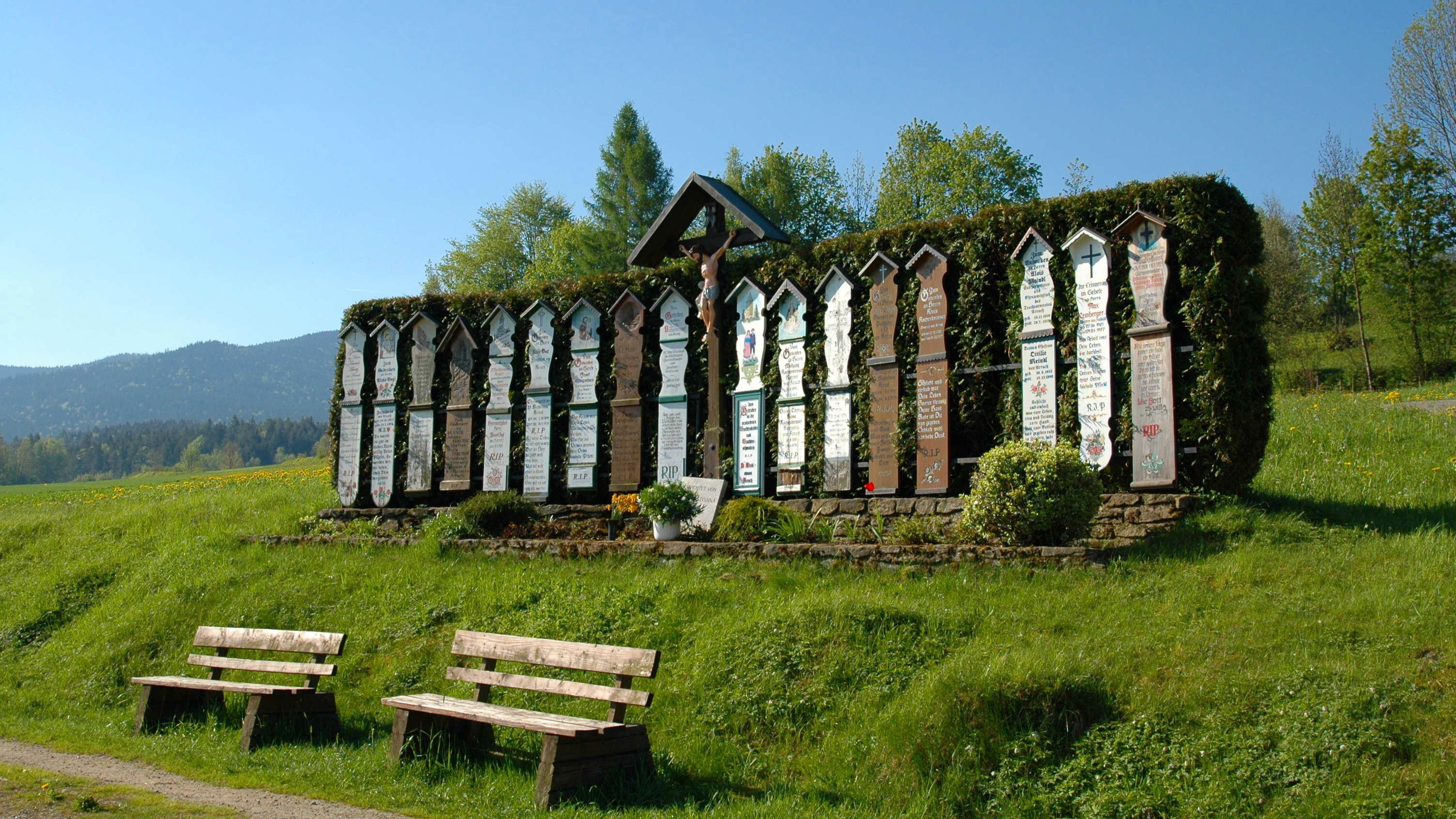 Welche Geschichten sich dahinter wohl verbergen? Dies alles und noch viel mehr erfahren Sie von unserer Wanderführerin, die sie auf dieser interessanten Wanderung zum Kolmstein begleitet.Wegbeschreibung:Zunächst gehen wir in Richtung Ortsmitte Haibühl. Wir überqueren die Straße und folgendem Pilgerweg "St. Wolfgang" über die Schwarzhölzlstraße nach Hinterhaibühl .Wir machen einen kurzen Halt an den "Totenbrettern" und erfahren von der Führerin Interessantes über deren Geschichte. Meist steht auch ein "Marterl" inmitten der Bretter.Auch hierzu erfahren Sie geschichtliches über dessen Tradition.Weiter führt uns der Weg Richtung Kolmstein. Nach einiger Zeit erreichen wir die Kreuzwegstationen."Der Bauer Josef Aschenbrenner von Stadlern hat 1886 von der Haibühl-Ottenzeller Seite her, die letzten zweihundert Meter bergan, einen Kreuzweg errichten lassen. Die vierzehn Säulen waren aus Eichenholz, gut behauen, etwa vier Fuß (1,20 m) über dem Erdboden hervorstehend. An der oberen Frontseite waren die vierzehn Kreuzwegtafeln aus Blech befestigt. Die Tafeln waren vom hiesigen Maler Jakob Stoiber, oder von seinem Sohn Josef, bemalt. Die Säulen waren ohne Anstrich. Auf den Säulen waren die vierzehn Kreuze, gleichfalls aus Eichenholz und schwarz angestrichen. Die Säulen waren voneinander 50 Fuß (=15m) entfernt."(Dies steht in einem Schreiben des Pfarramts Lam an das Bischöfliche Ordinariat in Regensburg.)1944 ließ die Familie Altmann von Stadlern von Haibühl-Ottenzell her einen neuen Kreuzweg aufstellen. Karl Stoiber von Haibühl hat 32x35 cm große Blechtafeln mit den Bildern des Fugel'schen Kreuzweges bemalt. Diese Blechtafeln wurden durch Gitter und Glas geschützt. Am 17. September 1944 wurde der neu errichtete Kreuzweg durch einen Franziskanerpater von Neukirchen benediziert.Da der Kreuzweg von Haibühl-Ottenzell her, den Karl Stoiber von Haibühl 1944 gemalt hat, stark beschädigt war, ließ die Familie Altmann von Stadlern 1971 einen neuen Kreuzweg aus 14 Steinsäulen mit Abdruckfiguren errichten. 2019 wurden die Steinsäulen des Kreuzweges komplett erneuert.Bald erreichen wir das malerisch gelegene Wallfahrtskircherl in Kolmstein - Denkmal der Gottes- und Nächstenliebe und Heiligtum Mariens. Wir stärken uns nach dem Aufstieg bei Kaffee, Kuchen oder einer Brotzeit in der Gaststätte “Kolmsteiner Hof”.Anschließend besichtigen wir das Wallfahrtskircherl mit dem berühmten Gnadenbild derschmerzhaften Mutter Gottes von Kolmstein und hören Geschichten vom ehemaligenPestfriedhof am Kolmstein und der Erbauerin des Kircherl “ Klara Wartner”, die auch im Seitenanbau des Kircherls begraben wurde.Wir wandern über den idylisch gelegenen "Oasiedlabrunn" quer durch den Wald zum Ausgangspunkt Haibühl zurück .Dort haben wir am Dorfplatz in Haibühl und in der St. Wolfgangskirche noch die Möglichkeit, die Hinterglasbilder u.a. auch der bekannten Volksmaler- und Bildhauerfamilien Stoiber aus Haibühl, zu besichtigen. Gesamtkilometer ca. 8 km, leichte TourAnmeldung unbedingt 1 Tag vorher in der TI-Arrach erforderlich bei TI Arrach 09943/1035, Lam 09943/777 oder Lohberg 09943/941313!Die Teilnahme erfolgt auf eigenes Risiko und Gefahr, keine Haftung für die Veranstalter!DER "WOLFGANGWEG"Der Pilgerweg führt von Böbrach nach Neukirchen/Hl. Blut: über Drachselsried, Arnbruck, Arrach, Haibühl und Kolmstein. Weitere Wegstrecken: Viechtach-Böbrach (Herzstück)Neukirchen/Hl. Blut nach Regensburg (St. Emmeram): über den Hohen Bogen nach Kötzting, Chamerau, Chammünster, Cham, Roding, Walderbach und Reichenbach (Klöster Reichenbach u. Walderbach).Böbrach/Viechtach nach St. Wolfgang (Oberösterreich): über Kollnburg, St. Englmar (Wolfgangskirche Rettenbach), Kostenz (Kloster), Grandsberg, Metten. Von dort aus auf dem Via Nova nach St. Wolfgang (Oberösterreich am Wolfgangsee).Weitere Informationen unter: www.wolfgangsweg.de