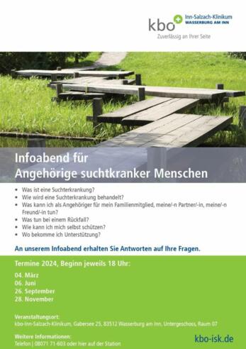 Beginn: 18:00 Uhr, kbo-Inn-Salzach-Klinikum Wasserburg, Haus 25Online finden Sie die Termine auch unter: