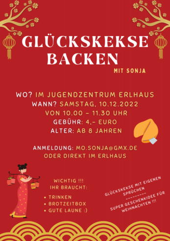 Jeder von euch kennt die Glückskekse, die man in einem chinesischen Restaurant bekommt. Diese enthalten doch unpersönliche Sprüche. Deswegen backen wir unsere eigenen Glückskekse mit persönlichen Sprüchen. Dies ist auch eine super Geschenkidee.Mitbringen: Brotzeitbox, TrinkenZeit: 10:00 – 11:30 UhrAlter: Ab 8 JahreKosten: 4€Anmeldung bei Sonja Motz unter mo.sonja@gmx.de