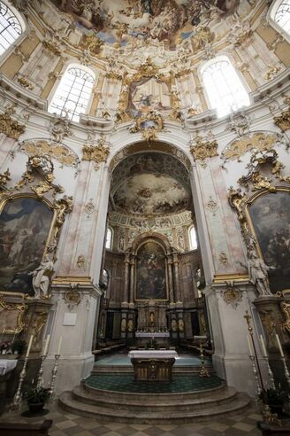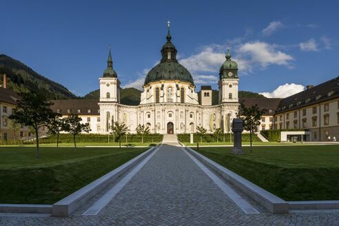 „Der Liebe zu Christus soll nichts vorgezogen werden" sagt der heilige Benedikt zweimal in seiner Regel und nennt damit sein Hauptanliegen: Christus gebührt der erste Platz. Er muss der Mittelpunkt des Klosters sein.In Ettal kommt dieses Anliegen sichtbar zum Ausdruck: Die Basilika, die Kirche des Klosters, steht unübersehbar im architektonischen Mittelpunkt. Hier feiert die Mönchsgemeinschaft täglich die Eucharistie, die Gegenwart Christi in unserer Welt.Kosten