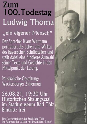 Zum 100.Todestag von Ludwig Thoma porträtiert Klaus Wittmann das Leben und Wirken des bayerischen Autors Ludwig Thoma und stellt dabei eine umfassende Auswahl aus seinen Texten, Gedichten und Briefen in den Mittelpunkt der Lesung.