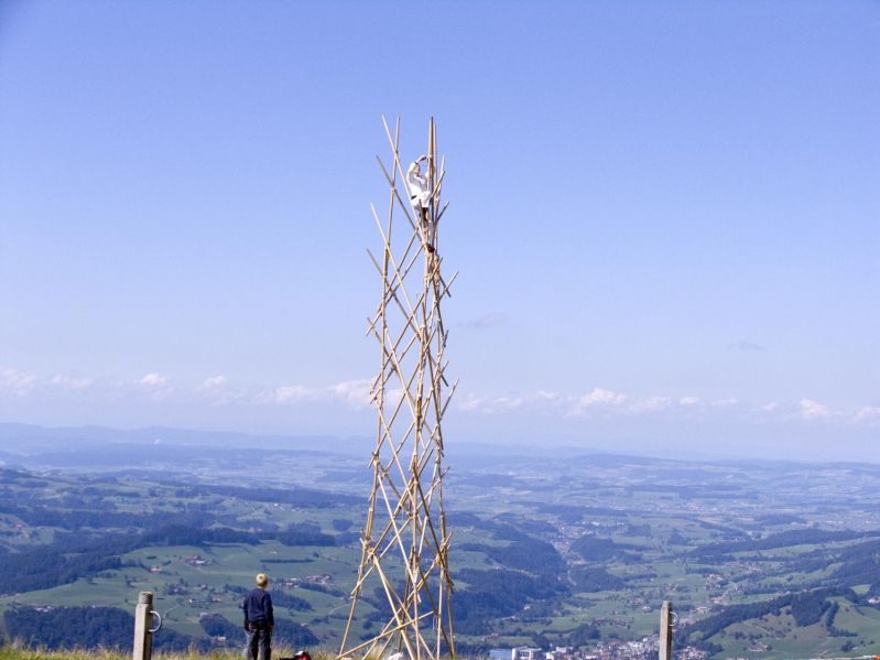 EINE HIMMLISCHE SONDIERBOHRUNG NACH ERKENNTNISIm Freien oder in einem hohen Raum liegt ein Sack aus dem das Ende eines 8 mm dicken Flachsseil hängt. Darum herum liegen kreuz und quer 47 Eschenstangen von 3 m Länge und 45 mm Dicke, beidseitig verjüngt. Drei weitere Stangen, in ihrer Mitte mit einem Flachsseil zusammengebunden und zum Dreibein gespreizt, erheben sich mitten im Stangen kreuz und quer über dem Sack. Heinz besteigt das Dreibein und verweilt kurz kauernd auf dem Schnitt-punkt der drei Stangen. Er greift sich, auf der Konstruktion kletternd, das zuoberst liegende Eschenholz vom Boden, zieht am aus dem Sack hängenden Seilende und löst ein 1.5 m langes Seil vom daran festgeknüpften nachfolgenden. Nun bindet er die Stange senkrecht an einen nach oben ragenden Arm des Dreibeins. Eine weitere aus dem Haufen gegriffene Stange verbindet das senkrecht installierte Holz mit einem Dreibeinbein und dem Boden. Indem nun Stange um Stange schon verbundenes verstrebt und stützt, entsteht ein Fundament, auf welchem der Turm allmählich an Höhe gewinnt. Heinz erweist sich als vorzüglich geeignet für das Hoch- und Runtergleiten im entstehenden Stangenlabyrinth. Zäh und flink lässt er Stangen und Seile als Bauwerk in den Himmel wachsen. Immer wieder prüft, analysiert und beweist Heinz mit Einsatz seines Körpers die Stabilität des Turms. Er unterbricht sein Tun durch drei Apfelpausen. Mit der Dritten hat das Bauwerk seine höchste Höhe erreicht. Das System der Konstruktion ist dasselbe wie das aller zuvor gebauten und noch zu bauenden Türme. Die Form jedoch ist jedesmal anders. Wenn eines Tages der endgültige Turm gebaut ist, wird Heinz ihn nach oben hin verlassen. Bis dahin aber löst er unverzüglich Stange von Stange, stellt sie an das Dreibein und wirft die Seile neben dem Turm zu einem Haufen. Was bleibt, wenn Heinz nach 3-4 Stunden den Boden wieder betritt und weggeht, ist ein Haufen Seile und die zusammengestellten Stangen, die jetzt an einen Heinzen erinnern.