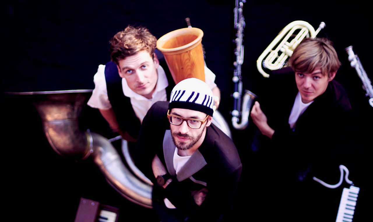 Mehr als zwei Dutzend Instrumente auf der Bühne, aber nur drei Musiker: David Helbock beschränkt sich weitgehend auf solche mit Tasten. Vogelwild die beiden unter anderem am Salzburger Mozarteum ausgebildeten Bläser. Johannes Bär ist fürs Blech zuständig, von Trompete über Bassflügelhorn bis zu hin zu Alphorn und Tuba. Andreas Broger spielt die Holzblasinstrumente: Saxophone, Klarinetten, Flöte.