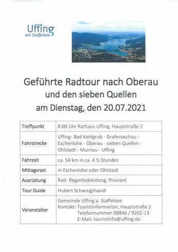 Geführte Radtour nach Oberau und den sieben QuellenTreffpunkt am Rathaus Uffing, Hauptstraße 2, vom Startpunkt geht es nach Bad Kohlgrub - Grafenaschau - Eschenlohe - Oberau - sieben Quellen - Ohlstadt - Murnau - Uffing.Die Strecke beträgt ca. 54 km in ca. 4 1/2 Stunden. Mittagsrast in Eschenlohe oder Ohlstadt.