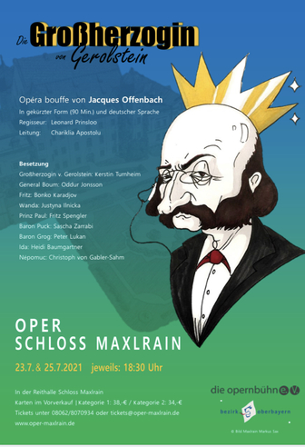 Die Opernbühne e. V. führt Jacques Offenbachs Opéra bouffe "Die Großherzogin von Gerolstein" auf. Es handelt sich um eine raffinierte und unterhaltende Satire über Gesellschaft und Politik. Inhaltlich witzig und spritzig, ist das Werk musikalisch geprägt von mitreißenden Rhythmen und geistreicher Melodik, Heiterkeit und Poesie. Es singt und spielt ein ausgezeichnetes Ensemble und der bestens bewährte Chor der Oper Schloss Maxlrain unter der musikalischen Leitung von Chariklia Apostolu. Für die Inszenierung konnte der international renommierte Regisseur Leonard Prinsloo gewonnen werden.