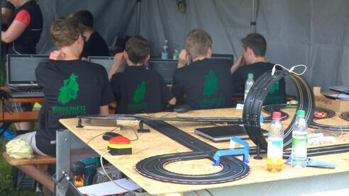 Kinder und Jugendliche basteln aus einem Vibrationsmotor und einer Zahnbürste einen Miniroboter.