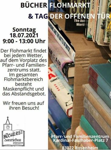 Sommerzeit = Urlauszeit = Lesezeit Für alle die noch nach spannender oder entspannender Lektüre für Strand, Balkon oder Couch suchen, ist unser Flohmarkt genau das Richtige. Für Alt und Jung! Da ist garantiert für jeden etwas dabei und das zu günstigsten Preisen!Der Flohmarkt findet bei jedem Wetter auf dem Vorplatz des Pfarr- und Familienzentrums Christkönig statt.Auf dem gesamten Flohmarktgelände besteht FFP2 Maskenpflicht (Ausnahmen nach gesetzlichen Vorschriften) und das Abstandsgebot. Das Bücherei Team Christkönig freut sich auf ihren Besuch!