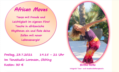 Der Workshop AFRICAN MOVES lädt alle dazu ein, sich mit Leichtigkeit und ganz ohne Leistungsdruck auf afrikanische Rhythmen einzulassen. Es werden einfache westafrikanische Choreographien getanzt, die sowohl für Anfänger*innen wie auch für Tänzer*innen mit Vorkenntnissen geeignet sind. Wir werden im angepassten Tempo tanzen, sodass die einzelnen Bewegungen erlernt und in ihrer Dynamik erfahrbar gemacht werden können. Nach und nach tanzt jede/r im eigenen Flow, im eigenen Ausdruck, und wird mit Freude und neuer Lebensenergie ins Wochenende gehen! (23.07, 19.15 - 21.00 Uhr, 30 € ) Anmeldung: nolte.britta@gmx.de