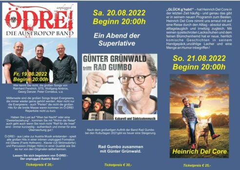 Ö-DREI - aus Liebe zur Austria Musik entstanden - spielt alle großen Hits in einer intimen unplugged Formation mit Gitarre (Frank Hofmann) , Klavier (Uli Strömsdörfer) und Percussion (Holger Höhn) in einer Qualität wie Sie es nur von den Originalen selbst kennen.