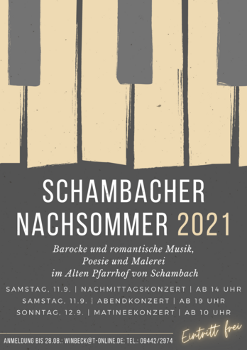 Wegen der geltenden Hygienevorschriften und der daraus resultierenden Teilnehmerbeschränkung für Innenräume bitten wir um verbindliche Voranmeldung für alle oder einzelne der drei Konzert-Blöcke bis 28.08.2021 bei Gerhilde Winbeck: E-Mail: winbeck@t-online.de oder Tel.: 09442 / 2974
