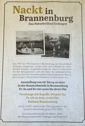 Ausstellung: Nackt in BrannenburgIm jetzigen Bildungshaus Verdi betrieb das Ehepaar Kallmeyer von 1907 bis 1913 ihr Naturheilbad Erdsegen. Angeboten wurden Licht- und Luftbäder für unbekleidete Kurgäste sowie andere Anwendungen. Bereits vorher hatten sie in zwei Büchern „Künstlerische Gymnastik“ und ein Leben in „Harmonie mit den Naturgesetzen“ propagiert.