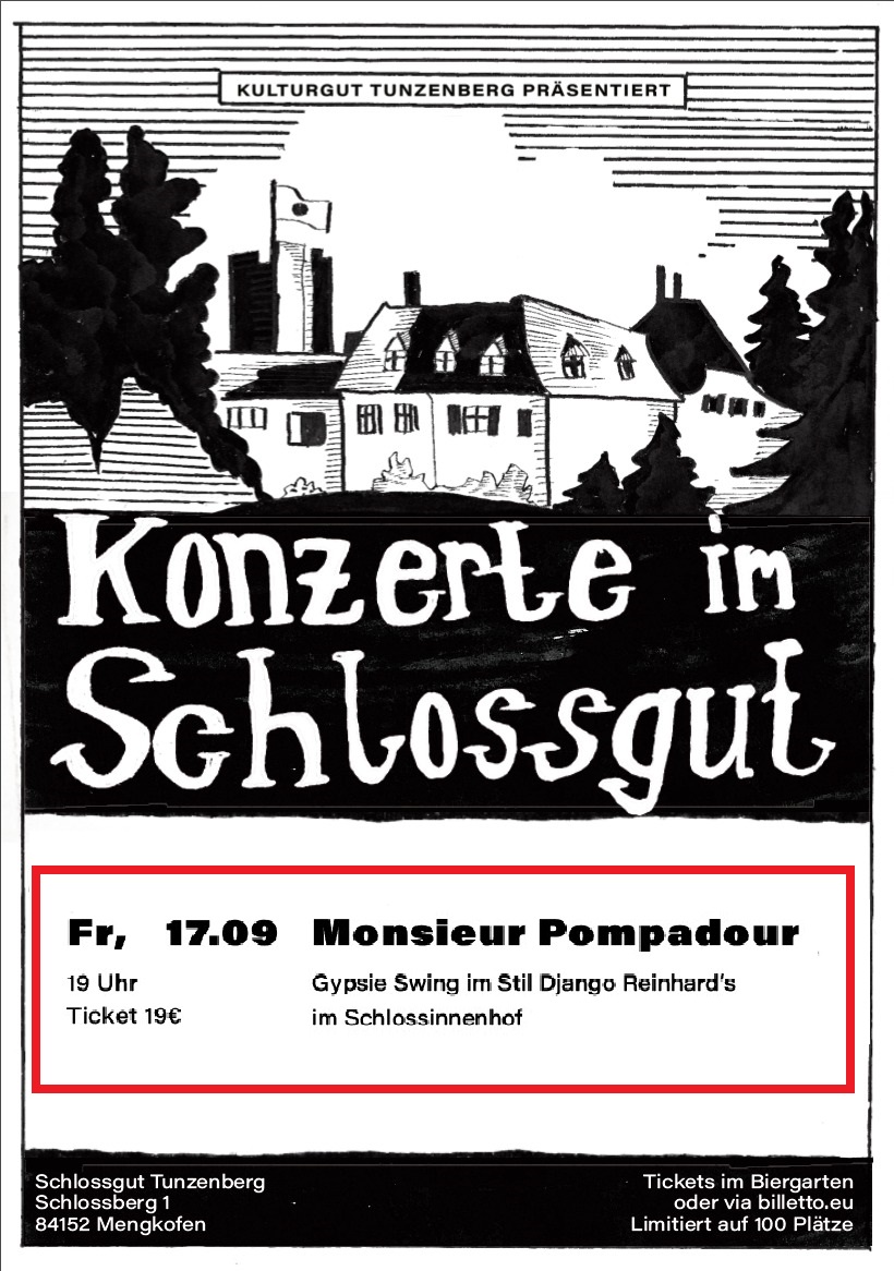Im Sommer 2014 verschlug es den französischen Bohéme Monsieur Pompadour nach Berlin. Zu dem illustren Kreis seiner rauschenden Feste gehörten ein belgischer Sänger, ein ungarischer Geiger, ein äußerst schweigsamer Bassist und ein adeliger Gitarrenvirtuose. Sie gründeten eine Band und überzeugen seither mit einer ganz speziellen Mischung aus heiterem Swing, ambitionierter Wildheit und einer Prise Melancholie. Lieder, Chansons und Songs über das Leben und die Liebe, vierstimmig gesungen und interpretiert im Stil ihrer Idole Django Reinhardt und Stephane Grappelli. Zum Einstand verlieh ihnen Monsieur Pompadour die Ehre seines wohl klingenden Namens und verschwand dann als blinder Passagier auf einem Luxusdampfer.
