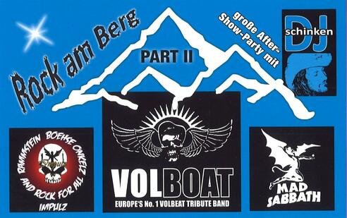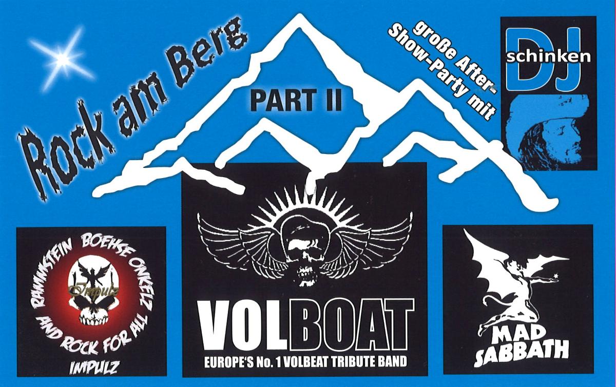 "Rock am Berg Part III" - Rockkonzert im "Waidlersaal", Gasthaus Bayerwald. * Es spielen drei Live-Bands: Impulz, Volboat und Mad Sabbath * anschließend große After-Show-Party mit DJ Schinken. Karten im Vorverkauf: Gasthaus Bayerwald, OMV-Tankstelle Sankt Englmar, Bandmitglieder sowie via Facebook. Preis: € 10,00 - Abendkasse € 12,00. Einlaß ab 18:00 Uhr - Beginn 19:00 Uhr.