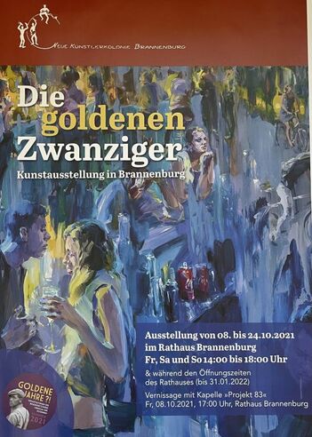 Die Künstler der Neuen Künstlerkolonie Brannenburg und Gastkünstler stellen die „Golden Zwanziger“ in den Mittelpunkt dieser Gemeinschaftsausstellung.Nach dem Schreckensjahr 1923 mit seiner Hyperinflation und vor der Weltwirtschaftskrise 1929 gab es eine Blütezeit der Kunst, Kultur und Wissenschaft. Geprägt war diese „goldene“ Zeit von einer weitgehend stabilen wirtschaftlichen Lage, einem neuen Frauenbild, freier Kunst und einem großen Vergnügungshunger. Aber waren die „goldenen Zwanziger“ auch ein „Tanz auf dem Vulkan“? Musste es zwangsläufig zu dem Schrecken der dreißiger und vierziger Jahre kommen?Mit ihrer ganz persönlichen, künstlerischen Handschrift, zeigen die Künstler, was ihnen zu diesem Thema durch den Kopf geht und machen ihre Gedanken sichtbar. Dabei bedienen sie sich verschiedener künstlerischer Ausdrucksmittel. Eine Gemeinschaftsausstellung lässt gut in das individuelle Schaffen der teilnehmenden Künstler blicken, verdeutlicht das Neben- und Miteinander verschiedener künstlerischen Ausdrucksmöglichkeiten und Sichtweisen. Die Motive der Künstler sind ebenso unterschiedlich wie ihre Techniken. Gezeigt wird Malerei, Grafik, Zeichnung, Bildhauerei und Skulptur. Zu sehen sind die unterschiedlichsten Genres, Gegenständliches und Abstraktes, Arbeiten, die zum Nachdenken anregen und Werke, die durch Emotionalität und auch Humor überraschen.