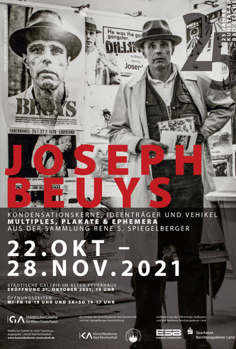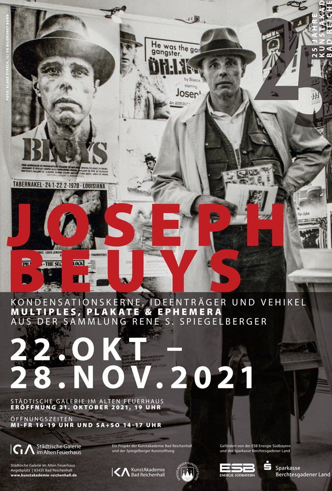 Unter dem Titel „JOSEPH BEUYS. Kondensationskerne, Ideenträger und Vehikel“ präsentieren die Kunstakademie Bad Reichenhall und die Spiegelberger Stiftung Hamburg anlässlich des 100. Geburtsages von Joseph Beuys eine umfangreiche Ausstellung mit signierten Plakaten, Multiples und Ephemera. Teilweise noch nie öffentlich gezeigte Dokumente werden in dieser ca. 250 Werke umfassenden Ausstellung präsentiert. Für Beuys stellten Plakate wie Multiples wichtige Kondensationskerne (also Energieträger) dar, an denen sich weitere Ideen und Personen andocken können und sich damit weiterverbreiten.