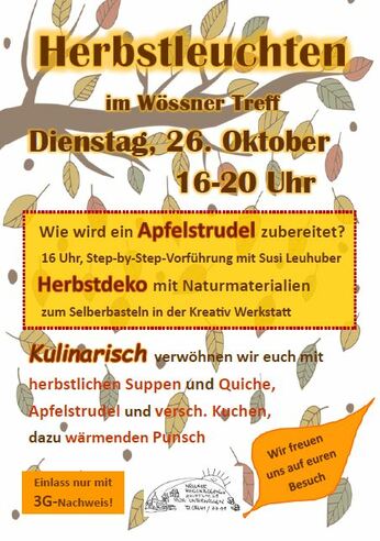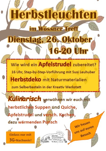 Kulinarisch verwöhnen wir Euch mit herbstlichen Suppen und Quiche, Apfelstrudel und versch. Kuchen, dazu wärmenden Punsch.