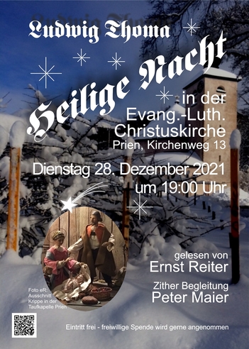 Ernst Reiter, bekannt als einer der Priener Verserlschreiber, liest die „Heilige Nacht“ bereits seit 2009, begleitet von Peter Maier aus Kolbermoor, mit virtuosem Zitherspiel.