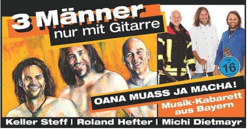 Wer oda wos is jetz des denkt sich vielleicht der Ein oder Andere... Hinter der Überschrift "3 Männer nur mit Gitarre" verbergen sich nicht nur 'oana', sondern die in der Liedermacher- und Kabarettszene weit über unsere bayerische Landesgrenze hinaus bekannten Gesichter vom Keller Steff, Roland Hefter und Michi Dietmayr.