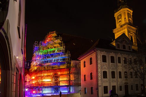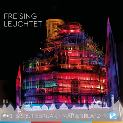 Der Stadtmarketingverein Aktive City Freising bringt Farbe in die Stadt. Die altehrwürdige Stadtpfarrkirche St. Georg wir derzeit umfassend renoviert. Animiert von der aktuell sichtbaren Gerüststruktur, die der Kirche eine nahezu gotisch anmutende Form einer Kathedrale verleiht, wird die noch nicht verhüllte Ostfassade, angrenzend zum Marienplatz, mit Licht stimmungsvoll in Szene gesetzt. Das Lichtdesign hebt die filigranen, aufsteigenden Gerüststreben hervor und verleiht der St. Georgs Kirche einen nie gesehen neuen Corpus. Mit der Lichtinszenierung will man die Stadtpfarrkirche - ein Wahrzeichen Freisings - wieder in Erinnerung bringen und mit der Licht-Kunst zum `Neuentdecken´ einladen.