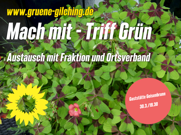 Unter dem neuen Titel "Mach mit - Triff Grün" laden die Gilchinger Grünen für Mittwoch den 30.3. / 19.30 Uhr ins Stüberl der Gaststätte Geisenbrunn ein.